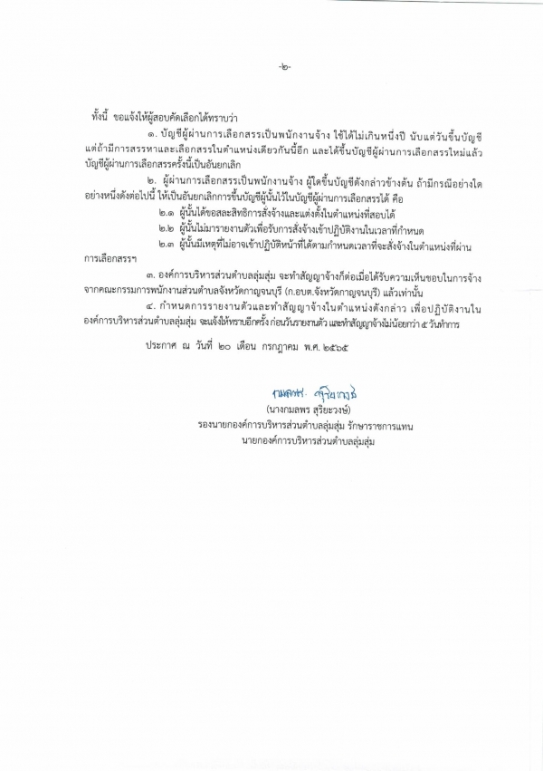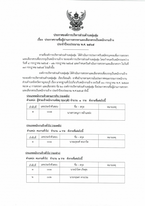 ประกาศองค์การบริหารส่วนตำบลลุ่มสุ่ม เรื่อง ประกาศรายชื่อผู้ผ่านการสรรหาและเลือกสรรเป็นพนักงานจ้าง ประจำปีงบประมาณ พ.ศ. ๒๕๖๕