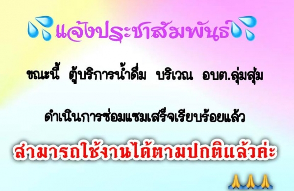 ประชาสัมพันธ์ ตู้บริการน้ำดื่ม หน้า อบต.ลุ่มสุ่ม สามารถใช้งานได้ตามปกติแล้วนะคะ