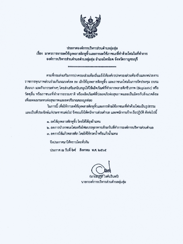 เรื่อง มาตรการลดใช้ถุงพลาสติกหูหิ้วและการลดใช้ภาชนะที่ทำด้วยโฟมในที่ทำการองค์การบริหารส่วนตำบลลุ่มสุ่ม อำเภอไทรโยค จังหวัดกาญจนบุรี