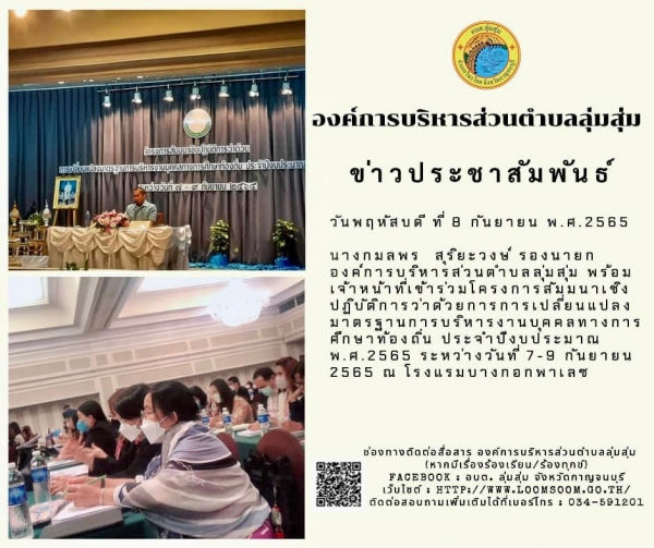 นางกมลพร สุริยะวงษ์ รองนายกองค์การบริหารส่วนตำบลลุ่มสุ่ม พร้อมเจ้าหน้าที่เข้าร่วมโครงการสัมมนาเชิงปฏิบัติการว่าด้วยการการเปลี่ยนแปลงมาตรฐานการบริหารงานบุคคลทางการศึกษาท้องถิ่น ประจำปีงบประมาณ พ.ศ.2565 ระหว่างวันที่ 7-9 กันยายน 2565 ณ โรงแรมบางกอกพาเลซ
