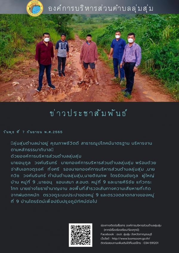 นายอนุกูล วงค์นรินทร์ นายกองค์การบริหารส่วนตำบลลุ่มสุ่ม ลงพื้นที่สำรวจเส้นทางความเสียหายที่เกิดจากฝนตกหนัก ตรวจดูระบบประปาของหมู่ 9 และตรวจตลาดกลางของหมู่ที่ 9 บ้านไตรรัตน์เพื่อปรับปรุงภูมิทัศน์ต่อไป