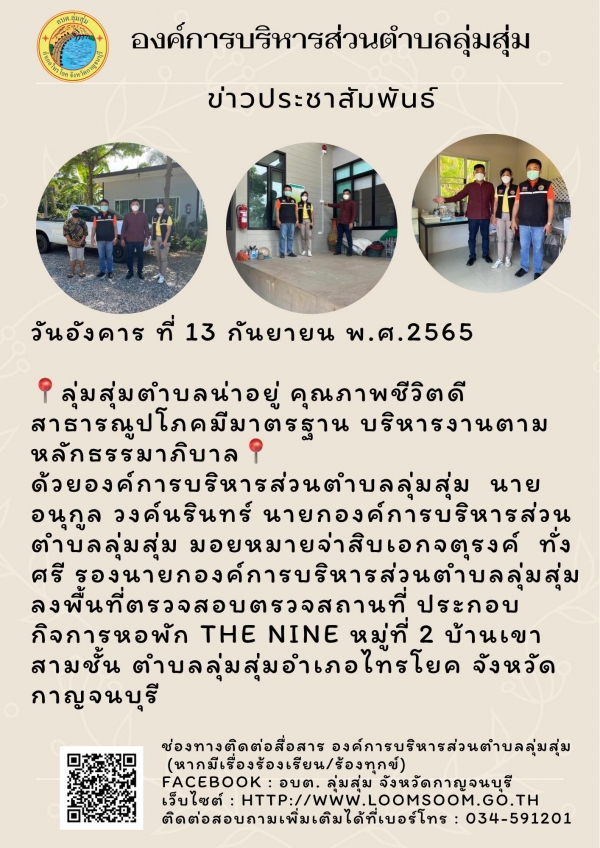 จ่าสิบเอกจตุรงค์ ทั่งศรี รองนายกองค์การบริหารส่วนตำบลลุ่มสุ่ม ลงพื้นที่ตรวจสอบตรวจสถานที่ ประกอบกิจการ หอพัก The nine หมู่ที่ 2 บ้านเขาสามชั้น ตำบลลุ่มสุ่มอำเภอไทรโยค จังหวัดกาญจนบุรี