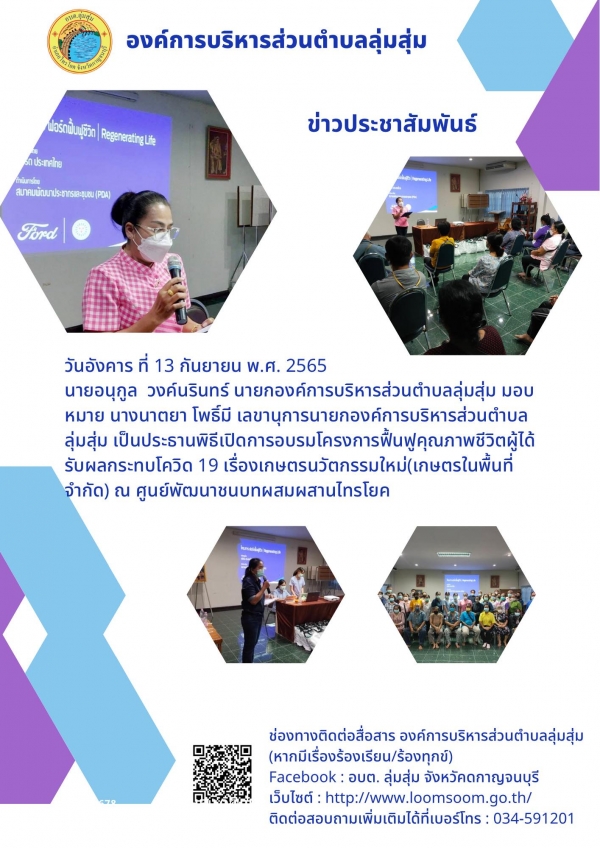 นายอนุกูล วงค์นรินทร์ นายกองค์การบริหารส่วนตำบลลุ่มสุ่ม มอบหมาย นางนาตยา โพธิ์มี เลขานุการนายกองค์การบริหารส่วนตำบลลุ่มสุ่ม เป็นประธานพิธีเปิดการอบรมโครงการฟื้นฟูคุณภาพชีวิตผู้ได้รับผลกระทบโควิด 19 เรื่องเกษตรนวัตกรรมใหม่(เกษตรในพื้นที่จำกัด) ณ ศูนย์พัฒนาชนบทผสมผสานไทรโยค