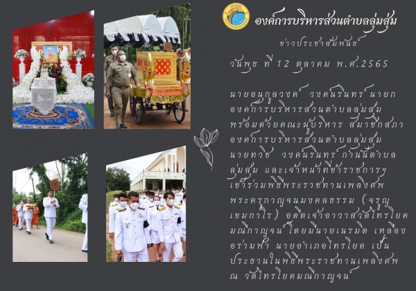 นายอนุกูลวงค์ วงค์นรินทร์ นายกองค์การบริหารส่วนตำบลลุ่มสุ่ม พร้อมด้วยคณะผู้บริหาร สมาชิกสภาองค์การบริหารส่วนตำบลลุ่มสุ่ม นายทวิช วงค์นรินทร์ กำนันตำบลลุ่มสุ่ม และเจ้าหน้าที่ข้าราชการฯ เข้าร่วมพิธีพระราชทานเพลิงศพพระครูกาญจนมงคลธรรม (จรูญ เขมกาโร)