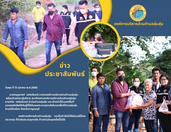 นายอนุกูลวงค์ วงค์นรินทร์ นายกองค์การบริหารส่วนตำบลลุ่มสุ่ม พร้อมด้วยคณะผู้บริหาร สมาชิกสภาองค์การบริหารส่วนตำบลลุ่มสุ่ม นายทวิช วงค์นรินทร์ กำนันตำบลลุ่มสุ่ม และเจ้าหน้าที่ร่วมลงพื้นที่มอบถุงยังชีพให้กับผู้ที่ได้รับผลกระทบอุทกภัยในเขตพื้นที่ตำบลลุ่มสุ่ม อำเภอไทรโยค จังหวัดกาญจนบุรี