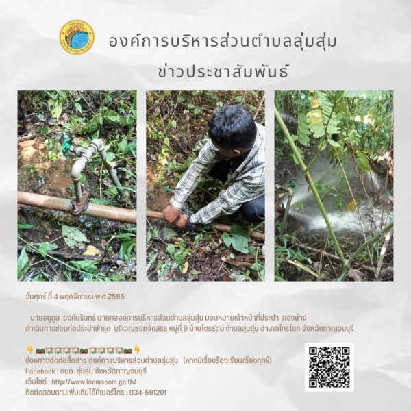 นายอนุกูล วงค์นรินทร์ นายกองค์การบริหารส่วนตำบลลุ่มสุ่ม มอบหมายเจ้าหน้าที่ประปา กองช่าง ดำเนินการซ่อมท่อประปาชำรุด บริเวณซอยจัดสรร หมู่ที่ 9 บ้านไตรรัตน์ ตำบลลุ่มสุ่ม อำเภอไทรโยคจังหวัดกาญจนบุรี