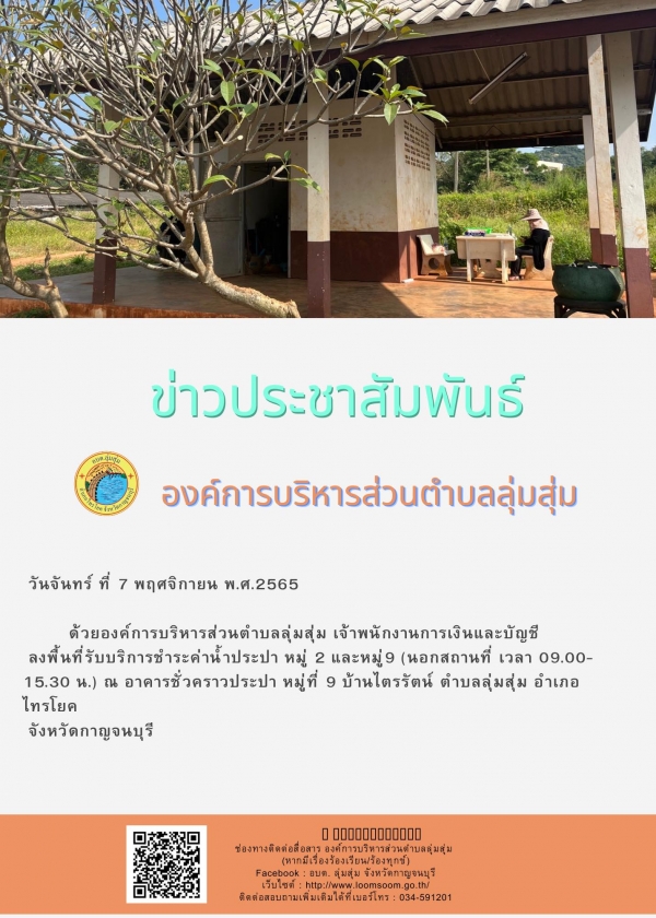 ด้วยองค์การบริหารส่วนตำบลลุ่มสุ่ม เจ้าพนักงานการเงินและบัญชี ลงพื้นที่รับบริการชำระค่าน้ำประปา หมู่ 2 และหมู่ 9 (นอกสถานที่ เวลา 09.00- 15.30 น.) ณ อาคารชั่วคราวประปา หมู่ที่ 9 บ้านไตรรัตน์ ตำบลลุ่มสุ่ม อำเภอไทรโยค จังหวัดกาญจนบุรี