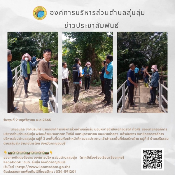 นายอนุกูล วงค์นรินทร์ นายกองค์การบริหารส่วนตำบลลุ่มสุ่ม มอบหมายจ่าสิบเอกจตุรงค์ ทั่งศรี รองนายกองค์การบริหารส่วนตำบลลุ่มสุ่ม พร้อมด้วยนางนาตยา โพธิ์มี เลขานุการนายก และนายจำลอง แก้วอัมพวา สมาชิกสภาองค์การบริหารส่วนตำบลลุ่มสุ่ม หมู่ที่ 3 ลงพื้นที่ร่วมกับเจ้าหน้าที่กรมชลประทาน เข้าสำรวจพื้นที่ก่อสร้างฝ่าย หมู่ที่ 8 บ้านเสรีธรรม ตำบลลุ่มสุ่ม อำเภอไทรโยค จังหวัดกาญจนบุรี