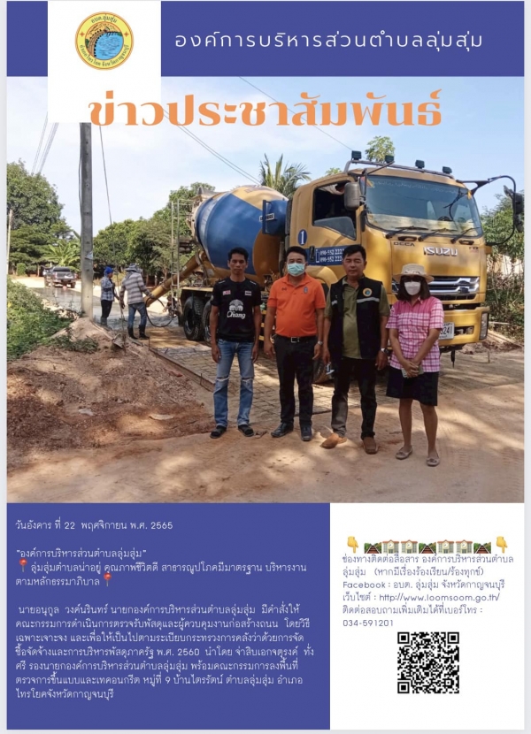 นายอนุกูล วงค์นรินทร์ นายกองค์การบริหารส่วนตำบลลุ่มสุ่ม มีคำสั่งให้คณะกรรมการดำเนินการตรวจรับพัสดุและผู้ควบคุมงานก่อสร้างถนน โดยวิธีเฉพาะเจาะจง และเพื่อให้เป็นไปตามระเบียบกระทรวงการคลังว่าด้วยการจัดซื้อจัดจ้างและการบริหารพัสดุภาครัฐ พ.ศ. 2560 นำโดย จ่าสิบเอกจตุรงค์ ทั่งศรี รองนายกองค์การบริหารส่วนตำบลลุ่มสุ่ม พร้อมคณะกรรมการลงพื้นที่ตรวจการขึ้นแบบและเทคอนกรีต หมู่ที่ 9 บ้านไตรรัตน์ ตำบลลุ่มสุ่ม อำเภอไทรโยค จังหวัดกาญจนบุรี