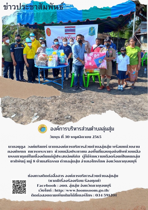 นายอนุกูล วงค์นรินทร์ นายกองค์การบริหารส่วนตำบลลุ่มสุ่ม พร้อมหน่วยงานกองทัพบก ทหารพระราชา ช่วยเหลือประชาชน ลงพื้นที่มอบถุงยังชีพช่วยเหลือบรรเทาทุกข์ในเบื้องต้นแก่ผู้ประสบอัคคีภัย ผู้ได้รับความเดือดร้อนเป็นคนกลุ่มชาติพันธุ์ หมู่ 8 บ้านเสรีธรรม ตำบลลุ่มสุ่ม อำเภอไทรโยค จังหวัดกาญจนบุรี